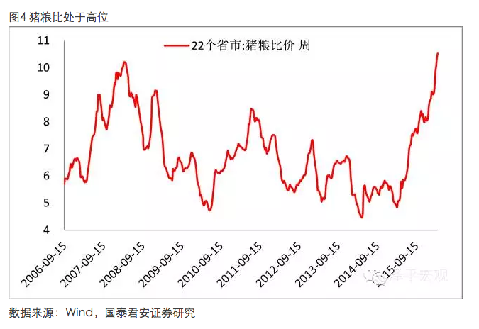 其次,豬價從15年3月開始上漲,基數(shù)逐漸升高,同比數(shù)據(jù)上升速度會下降。最后,受廠房規(guī)模限制和生豬成本價格比影響,壓欄時間最多在1-2個月。當存在通脹預期時,養(yǎng)殖戶預期生豬價格可能上漲,邊際上會有更多的人愿意延遲出欄以獲得較高的利潤(“壓欄”)。那么市場上短期的生豬供應量會相應減少,從而導致生豬價格的上漲。但據(jù)了解,散戶容易出現(xiàn)壓欄行為,大型養(yǎng)殖場受廠房限制影響不容易出現(xiàn)壓欄行為;生豬出欄量高于230斤后,成本價格比將變得不劃算。