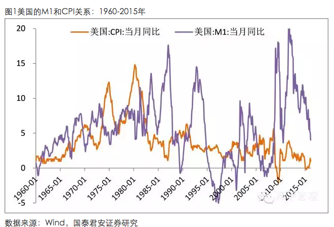 在美國,1980年以前M1對CPI的領先跡象比較明顯,但是近30年以來,二者的先行滯后關系很不顯著。1980年是美國經(jīng)濟結構的重要轉折點,1980年美國經(jīng)濟完成了重化工的發(fā)展階段,向信息產(chǎn)業(yè)和服務業(yè)時代轉型,煤電油運等傳統(tǒng)的瓶頸部門已經(jīng)不再構成瓶頸約束,貨幣供應不再直接通過瓶頸部門對實體經(jīng)濟產(chǎn)生直接影響,而主要通過大宗商品和虛擬經(jīng)濟產(chǎn)生間接影響,因此M1向實體經(jīng)濟和CPI的影響方式和傳導機制發(fā)生了根本性的改變。