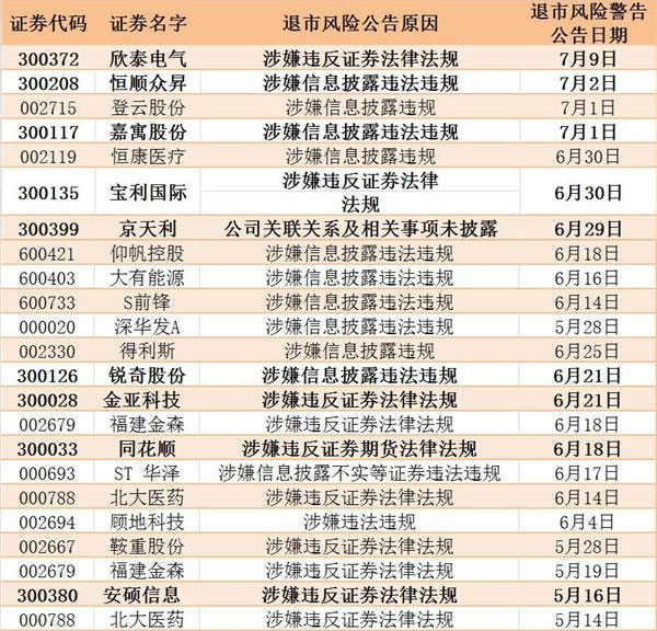 同花順因有非法經(jīng)營證券業(yè)務行為,而被證監(jiān)會立案調(diào)查,6月18日時仍在發(fā)布暫停上市的風險警示;銳奇股份則是“涉嫌信息披露違法違規(guī)”而被立案調(diào)查,最后一份風險警示發(fā)布于6月21日。此外,金亞科技由于公司及實際控制人涉嫌違反法律法規(guī)而被調(diào)查中,恒順眾昇、嘉寓股份和寶利國際也仍在等待證監(jiān)會的調(diào)查結(jié)果。