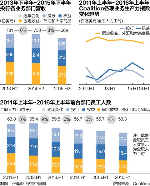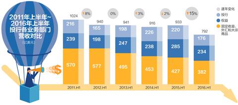包括股票和債券交易、并購咨詢業(yè)務(wù)以及融資等在內(nèi),這些大投行今年上半年的各項(xiàng)營收總額為792億美元,遠(yuǎn)低于2015年上半年的933億美元,相較于2009年上半年投行的營收頂峰1400億美元,則跌了將近一半。
