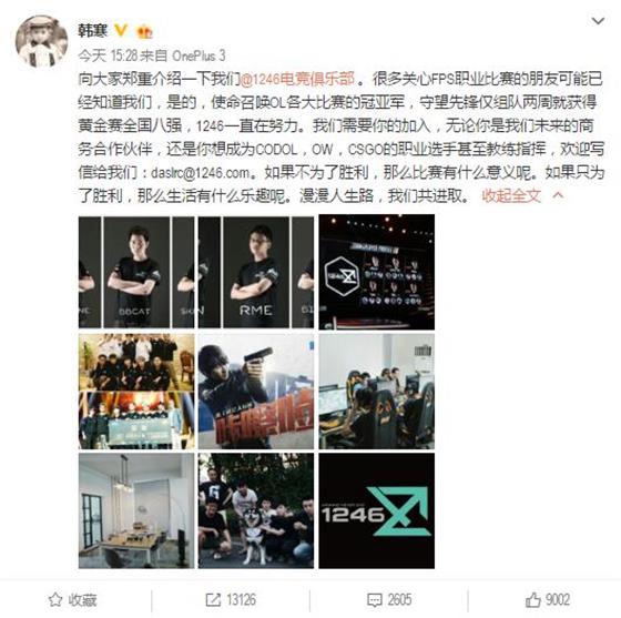 韓寒自己也表示,電競職業(yè)選手很辛苦。