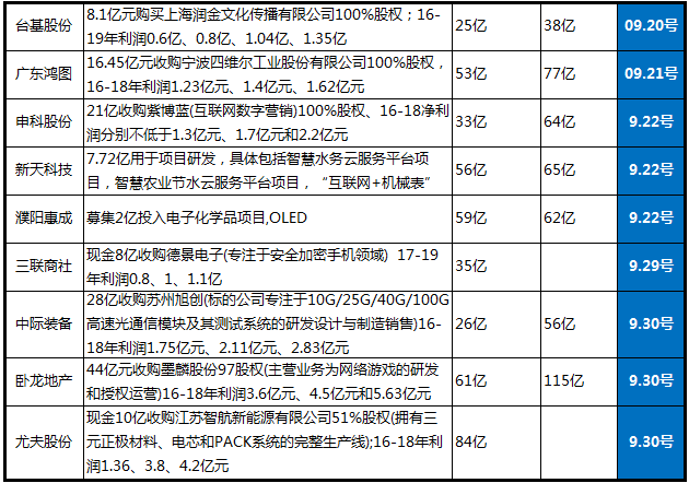 小結(jié):A股近幾年定增大浪潮背景下,通過內(nèi)外雙輪驅(qū)動的公司成為屢創(chuàng)新高牛股層次不窮。根據(jù)比例統(tǒng)計每年創(chuàng)歷史新高的標的中有30%-50%涉及了增發(fā)資產(chǎn)。本文通過9月份部分案例“拋磚迎玉”列舉了多數(shù)下涉及涉及重大資產(chǎn)重組的個股類型,復牌定增第二波如何辨析公司,通過定增標的1.發(fā)布增發(fā)方案公司本身屬性(公司市值大小、所處行業(yè)、原有市值對應利潤) 2.方案優(yōu)劣(募集資金收購資產(chǎn)情況、盈利承諾) 3.停復牌高低點 4.市場環(huán)境 四要素構(gòu)筑了增發(fā)標的復牌后走勢收益率,四個重要基本因素分析了定增個股后續(xù)走勢的相關(guān)性。根據(jù)長期研究下來結(jié)果。定增第二波的難度主要來自于1.涉及標的方案是否被證監(jiān)會通過 2.裝入方案未來盈利能否符合承諾預期 (深度基本面研究對普通投資者難度頗大),根據(jù)數(shù)據(jù)反映目前A股涉及表外并購業(yè)績承諾達標率在60% 3.不同市場環(huán)境下給予的PE完全不同。4.交易水平高低,對于標的復牌技術(shù)圖形的跟蹤理解。由于定增標的案例頗多,本文列舉部分案列,未來會通過多篇文章逐步揭秘二級市場定增第二波“打發(fā)”,以及各類由于停牌階段屬于高位的地理股如何辨析。