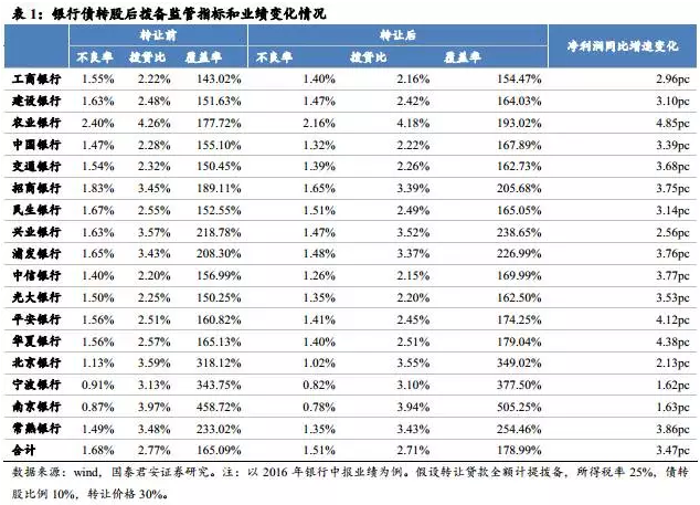 因此,對(duì)于銀行而言,轉(zhuǎn)出撥備計(jì)提充分的不良,會(huì)貢獻(xiàn)賬面利潤(rùn)。我們以銀行中報(bào)數(shù)據(jù)為起點(diǎn),大致測(cè)算下,如果各銀行的不良貸款中有10%做債轉(zhuǎn)股轉(zhuǎn)出,不良撥備100%,轉(zhuǎn)讓價(jià)30%,那么將使利潤(rùn)增速比原來(lái)增加1-5個(gè)百分點(diǎn)。