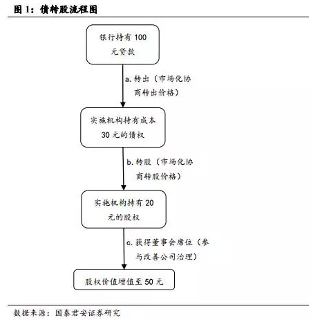 銀行持有一筆100元的貸款,借款企業(yè)經(jīng)營(yíng)治理很糟糕,已劃為不良,經(jīng)評(píng)估覺(jué)得企業(yè)還不是完全沒(méi)救,準(zhǔn)備做債轉(zhuǎn)股。于是把貸款做價(jià)30元轉(zhuǎn)讓給實(shí)施機(jī)構(gòu)。然后實(shí)施機(jī)構(gòu)去和企業(yè)談轉(zhuǎn)股,100元債權(quán)轉(zhuǎn)成它20%的股權(quán)(注意,其成本是30元),并獲得董事會(huì)席位。然后,實(shí)施機(jī)構(gòu)參與改善公司經(jīng)營(yíng)治理(由于負(fù)債下降,企業(yè)本身情況本身也會(huì)比從前好一些),從而使其股權(quán)升值,其持股價(jià)值達(dá)到50元,而后退出,獲利20元。
