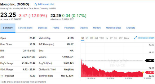陌陌發(fā)布第三季度財報當(dāng)天,股價一路下滑近13%,跌破其50日均線