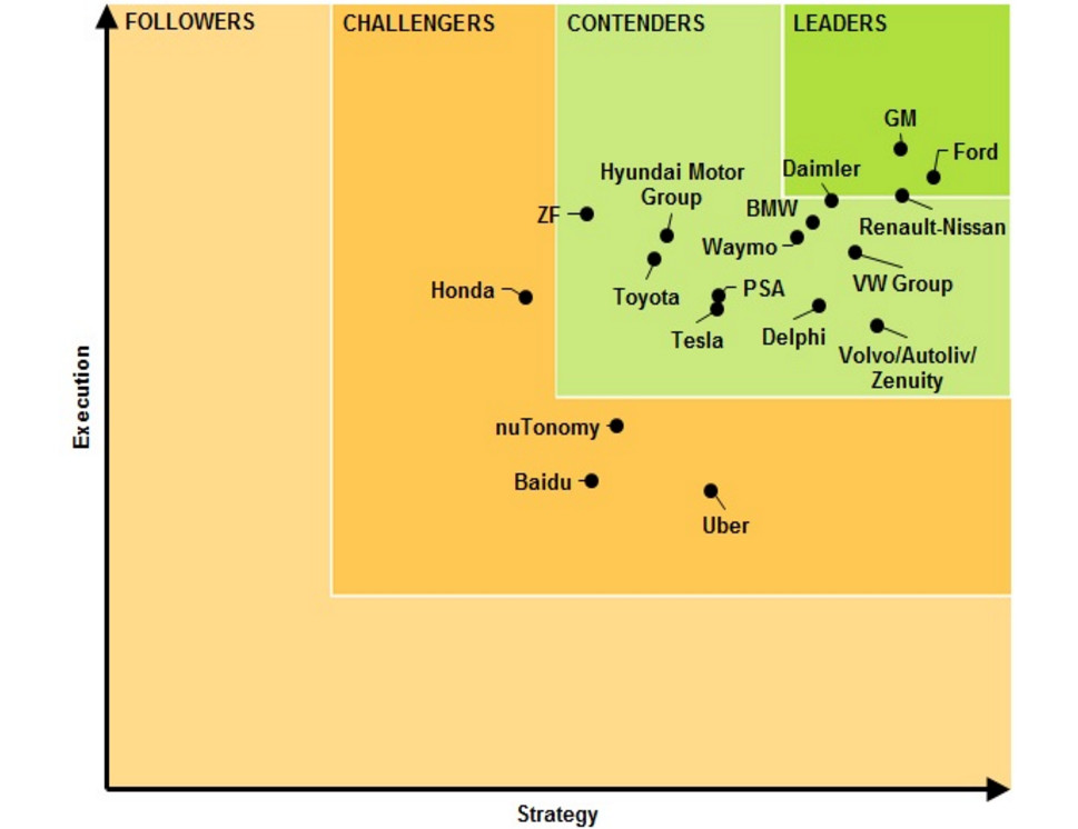 被歸到第二梯隊(duì)的有戴姆勒-梅賽德斯-奔馳、大眾、寶馬、谷歌Waymo、沃爾沃/Autoliv/Zenuity、德爾福、現(xiàn)代、標(biāo)致雪鐵龍、特斯拉、豐田、采埃孚。