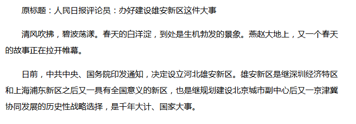 據(jù)新華社報道,日前,中共中央、國務院印發(fā)通知,決定設(shè)立河北雄安新區(qū)。這是繼深圳經(jīng)濟特區(qū)和上海浦東新區(qū)之后又一具有全國意義的新區(qū),也是深入推進京津冀協(xié)同發(fā)展的一項重大決策部署,是千年大計、國家大事。