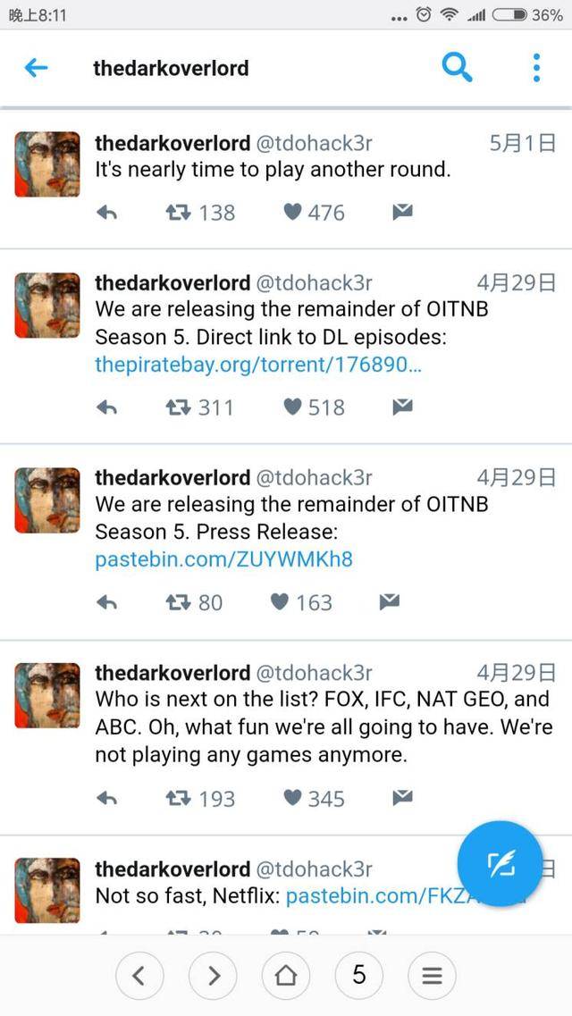 然而這事隨著時間推移不了了之,Larson Studios沒交贖金,而The Dark Lord也把目標轉移到Netflix和其他更有錢的電視臺身上。在Netflix沒付贖金慘遭“撕票”后,The Dark Lord在Twitter上揚言:該玩下一輪了,下一個找誰呢,F(xiàn)OX、IFC、國家地理還是ABC?