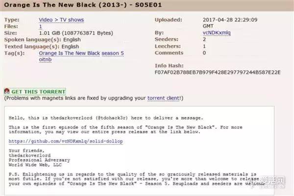 很多人并不知道,這次針對好萊塢的勒索已經持續(xù)了半年。去年年底,一個名為“The Dark Lord”的黑客組織(也可能是一個人)宣稱他們盜取了37部尚未上映的電影、電視劇甚至綜藝片源,其中Netflix《女子監(jiān)獄》第五季、CBS《海軍罪案調查處:洛杉磯》、還有前段時間在中國熱映的動作片《極限特工3》都赫然在列。