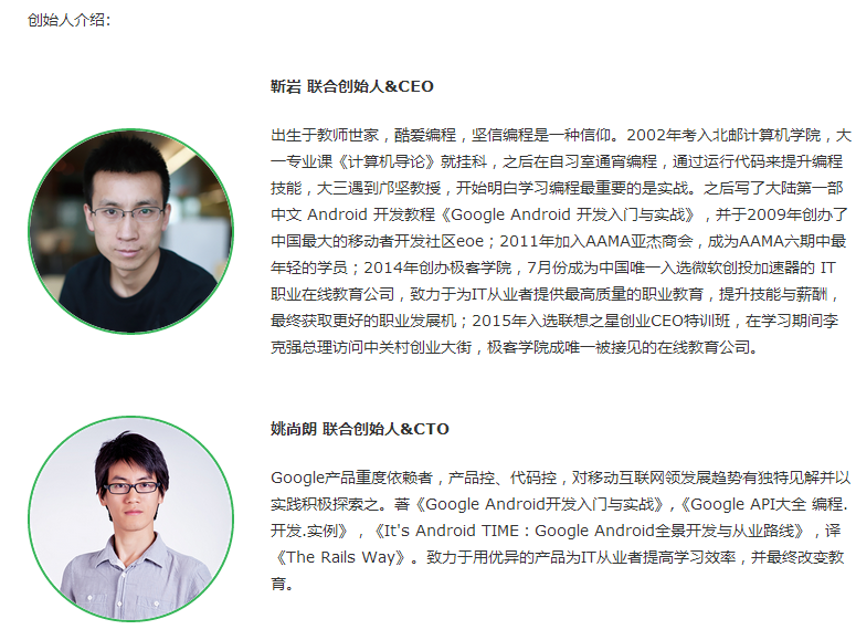 在極客學院的官網(wǎng)介紹上,目前只有聯(lián)合創(chuàng)始人&CEO靳巖和聯(lián)合創(chuàng)始人&CTO姚尚朗的介紹。其實在半年前,這里還有另外兩個聯(lián)合創(chuàng)始人的介紹,他們分別是營銷負責人李杰,以及運營和HRD負責人王鑫。下面是當年的介紹,而今這兩位聯(lián)合創(chuàng)始人的微博認證資料都改為前極客學院聯(lián)合創(chuàng)始人。