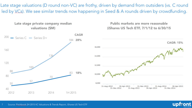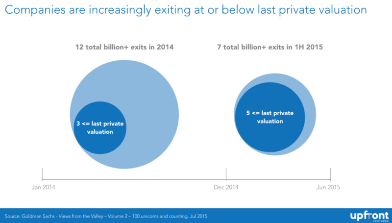 通常而言,市場總會帶來一些提示。2014 年,12 次估值中就有 3 次比上一輪估值要低。25% 的 down round(后一輪估值比上一輪低的融資輪次)比例著實可悲??墒堑搅?2015 年,down round 的比例高達 71%,7 次估值中就有 5 次比上一輪估值要低。