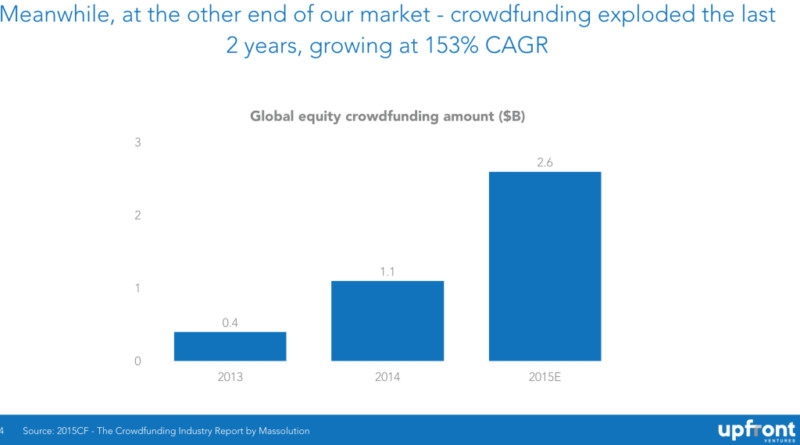 如果不承認眾籌在創(chuàng)業(yè)公司中所扮演的重要角色,那就無法準(zhǔn)確地討論 2016 年風(fēng)險投資行業(yè)的愿景及展望。在過往的兩年中,我們看到有大量的科技創(chuàng)業(yè)公司通過眾籌平臺獲得資金。同樣在過往的兩年中,眾多新興眾籌平臺如雨后春筍般在全球各地涌現(xiàn),眾籌的金額也水漲船高,從兩年前的 4 億美元暴漲至 26 億美元。