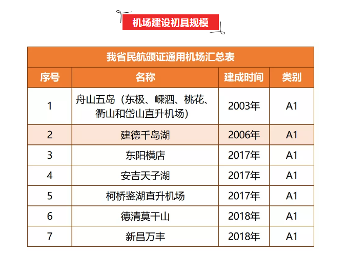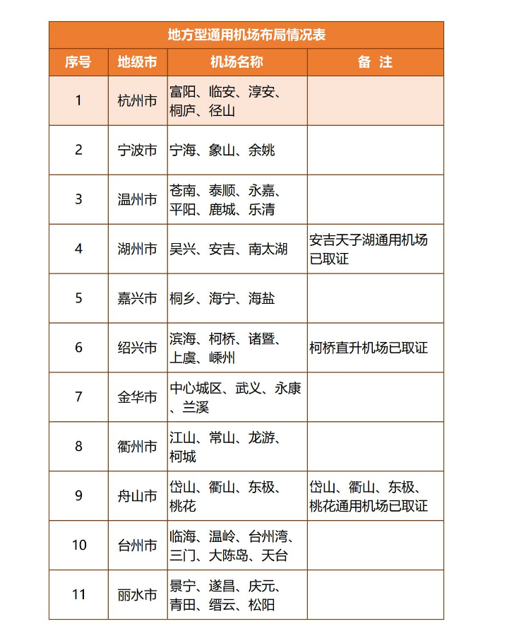 截至2019年底,浙江省已建7個民用運輸機場均已開展通用航空業(yè)務(wù),新建的嘉興和麗水機場也已規(guī)劃通航區(qū)域。省內(nèi)已有建德千島湖、東陽橫店等經(jīng)民航頒證A類通用機場11個,已經(jīng)軍方批準(zhǔn)場址待實施通用機場7個,其他起降場地15個。